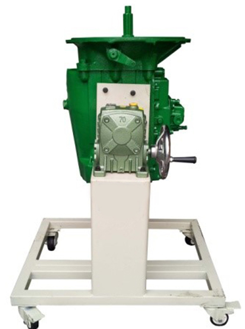 1.采用翻新天錦EQ1120GA2 8JS125TA型手動變速器總成(附件齊全,易于拆裝),并裝在專用翻轉架上。 采用減速翻轉機構,可使變速器旋轉任意角度,并能任意位置鎖止,便于學生從不同的角度進行拆卸和裝配。